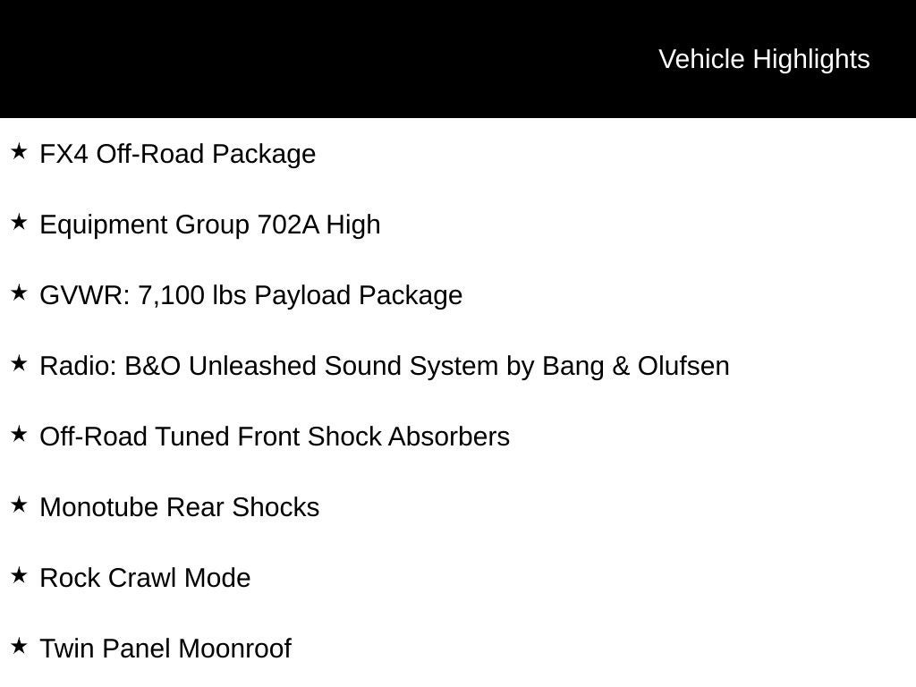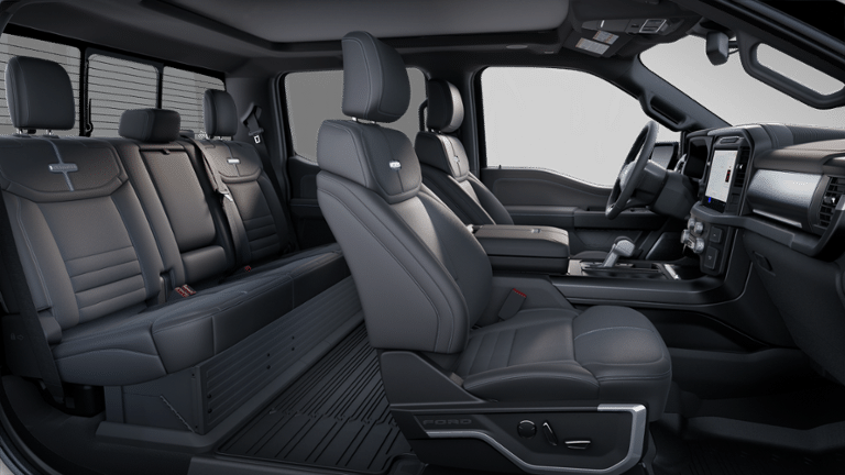 Inside, the cabin is a true sanctuary, with premium leather-trimmed seating, dual-zone climate control, and the stunning B&O Unleashed sound system. The twin-panel moonroof and heads-up display add an extra touch of sophistication, while the ample storage and versatile cargo bed make this F-150 a true workhorse.