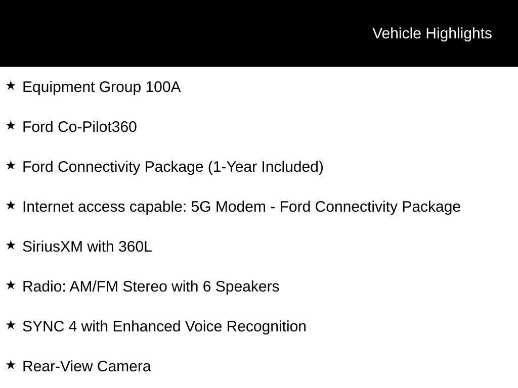 • SYNC 4 with Enhanced Voice Recognition, SiriusXM with 360L, Rear-View Camera, and Auto High Beams