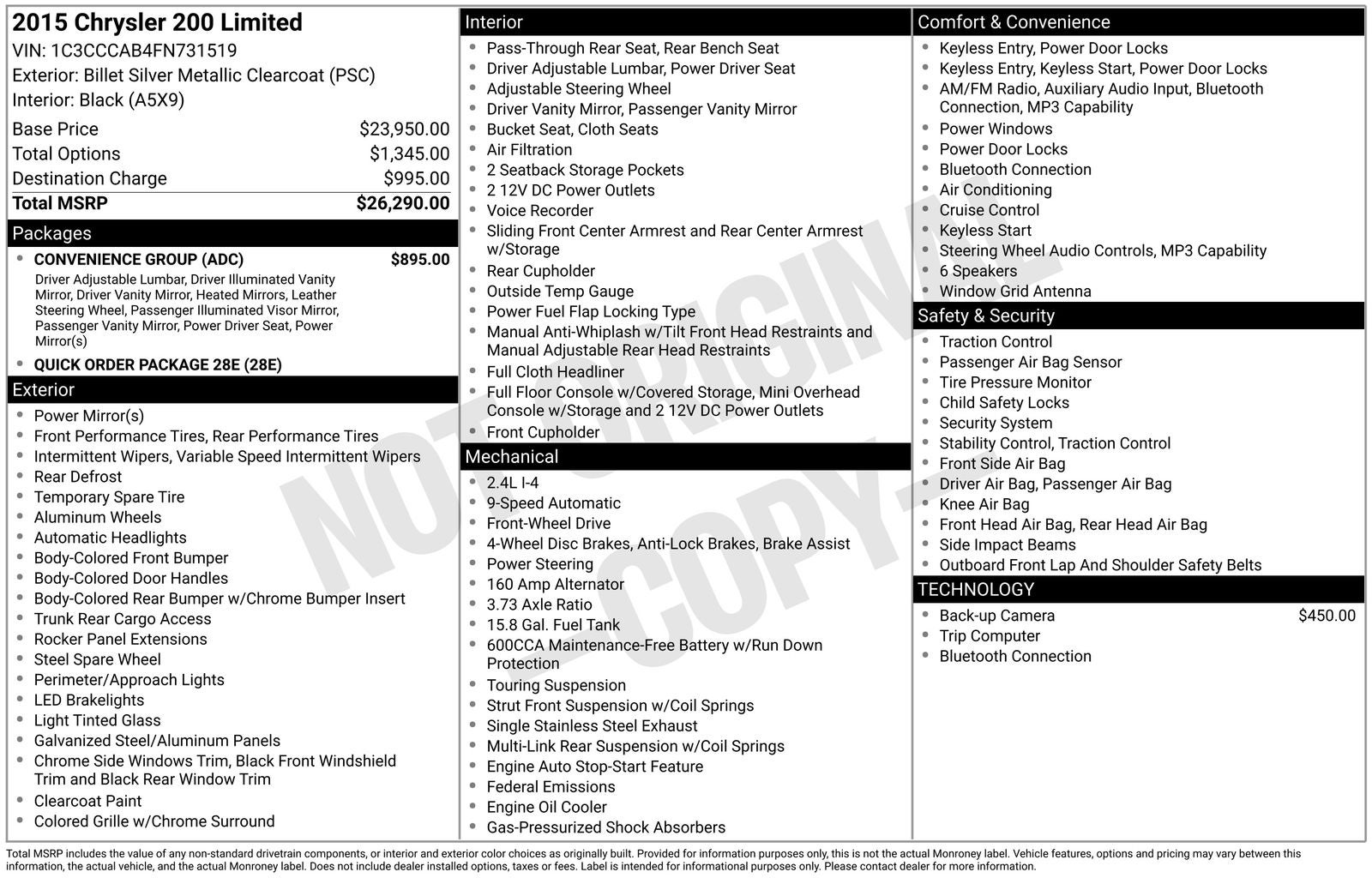 Billet Silver Metallic Clearcoat 2015 Chrysler 200 Limited FWD 9-Speed 948TE Automatic 2.4L I4 MultiAir Black Cloth.