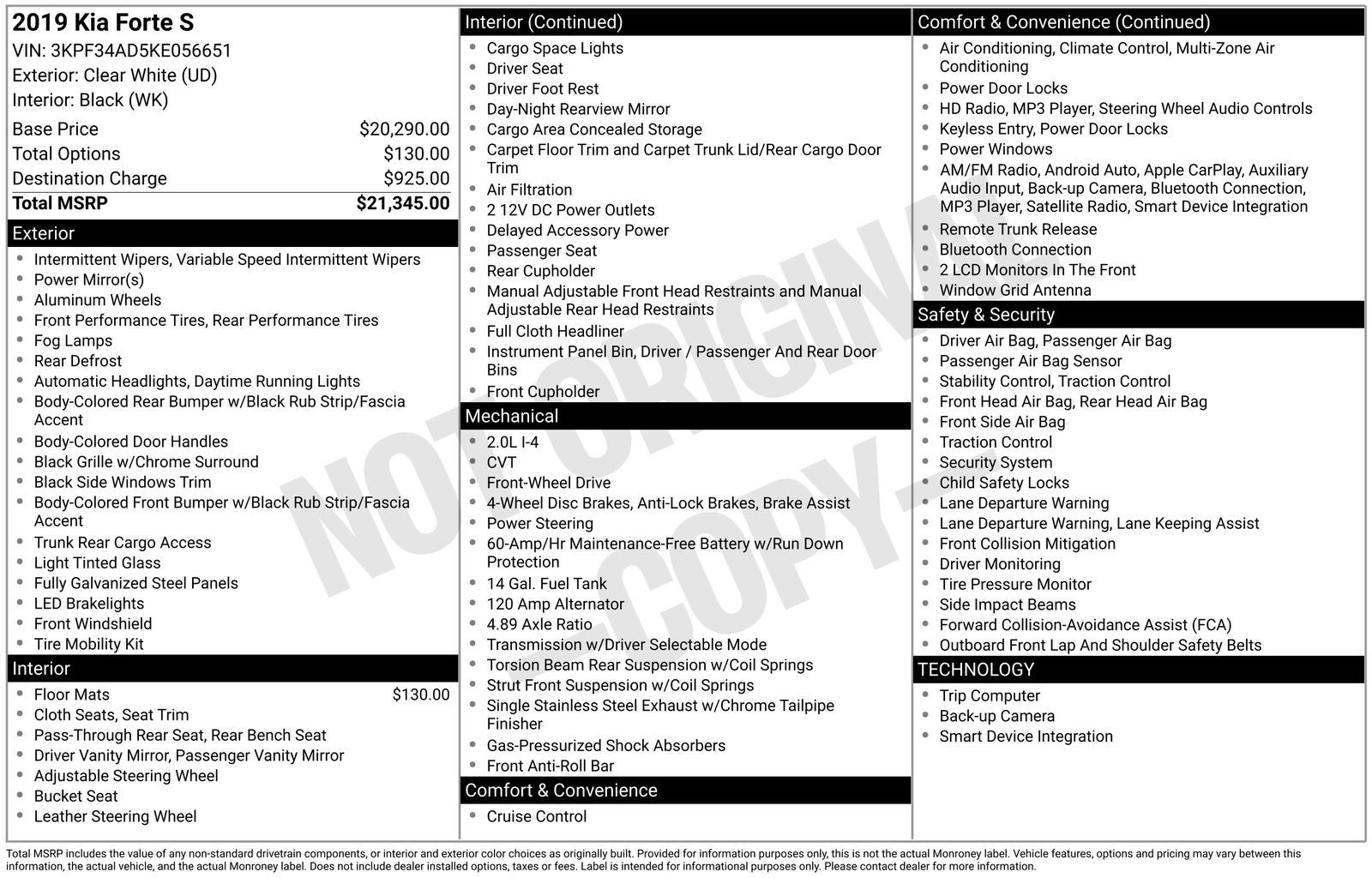 Clear White 2019 Kia Forte S FWD CVT 2.0L I4 DOHC Dual CVVT