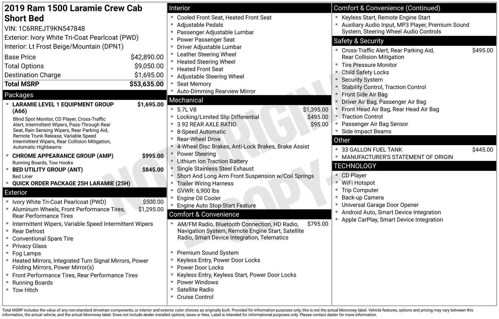 Ivory White Tri-Coat Pearlcoat 2019 Ram 1500 Laramie RWD 8-Speed Automatic HEMI 5.7L V8 Multi Displacement VVT