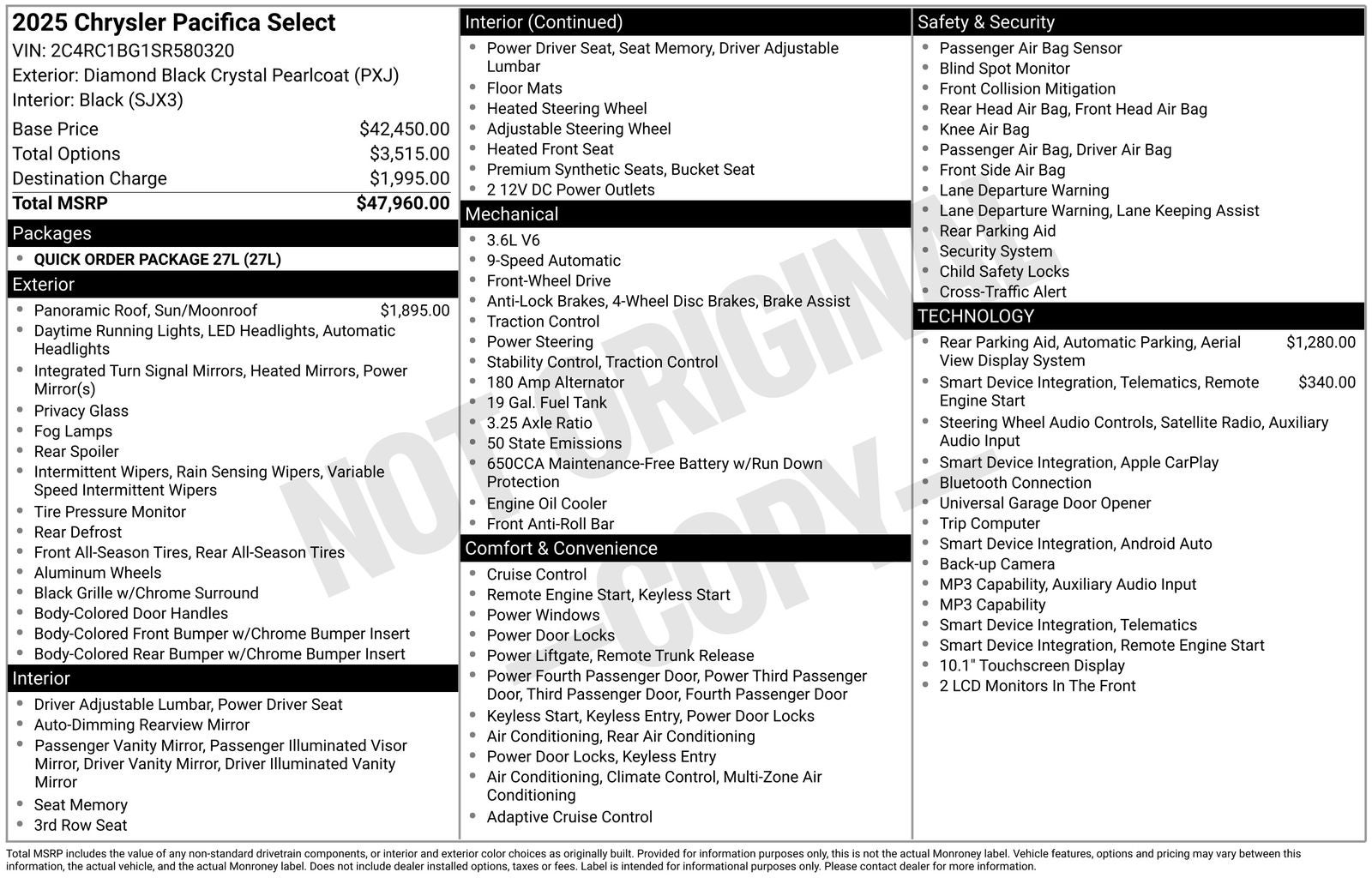 Diamond Black 2025 Chrysler Pacifica Select FWD 9-Speed 948TE Automatic 3.6L V6 24V VVT